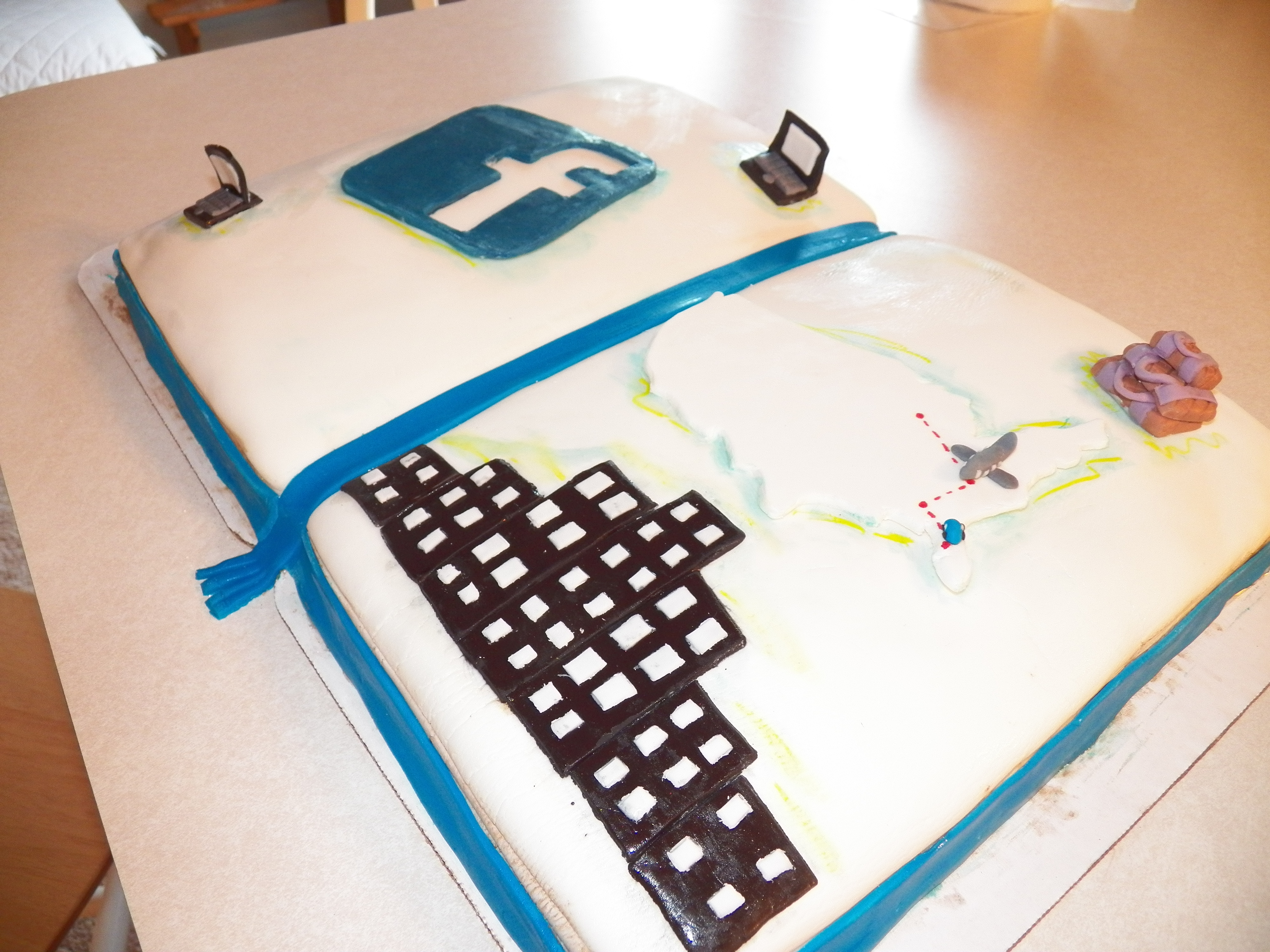 this cake is a book that i will write about my year and a half of meeting facebook friends. on the left hand page are two computers–mine and jennifer’s–joined by facebook. on the right hand page is a plane traveling to florida, where i will meet her. not this trip, maybe, but next one!