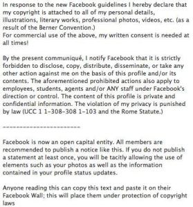 this post has been showing up on a lot of timelines, a declaration that the user claims copyright to the profile’s content and that facebook can’t “own” the profile. this seems mainly to concern my american and european friends. copyright has become incredibly burdened by the freewheeling internet.
